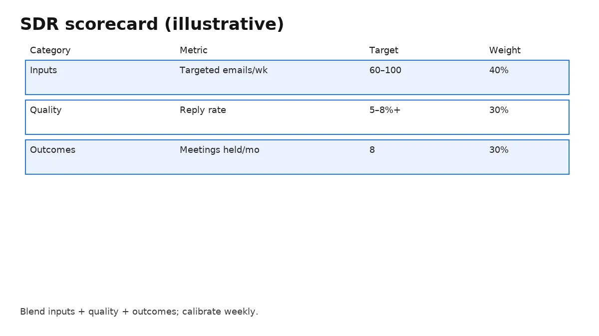 Score SDRs on inputs, quality, and outcomes with explicit rubrics. Start 50/30/20 (inputs/quality/outcomes) in ramp, shift to 30/30/40 by month three. Review weekly with coaching notes.