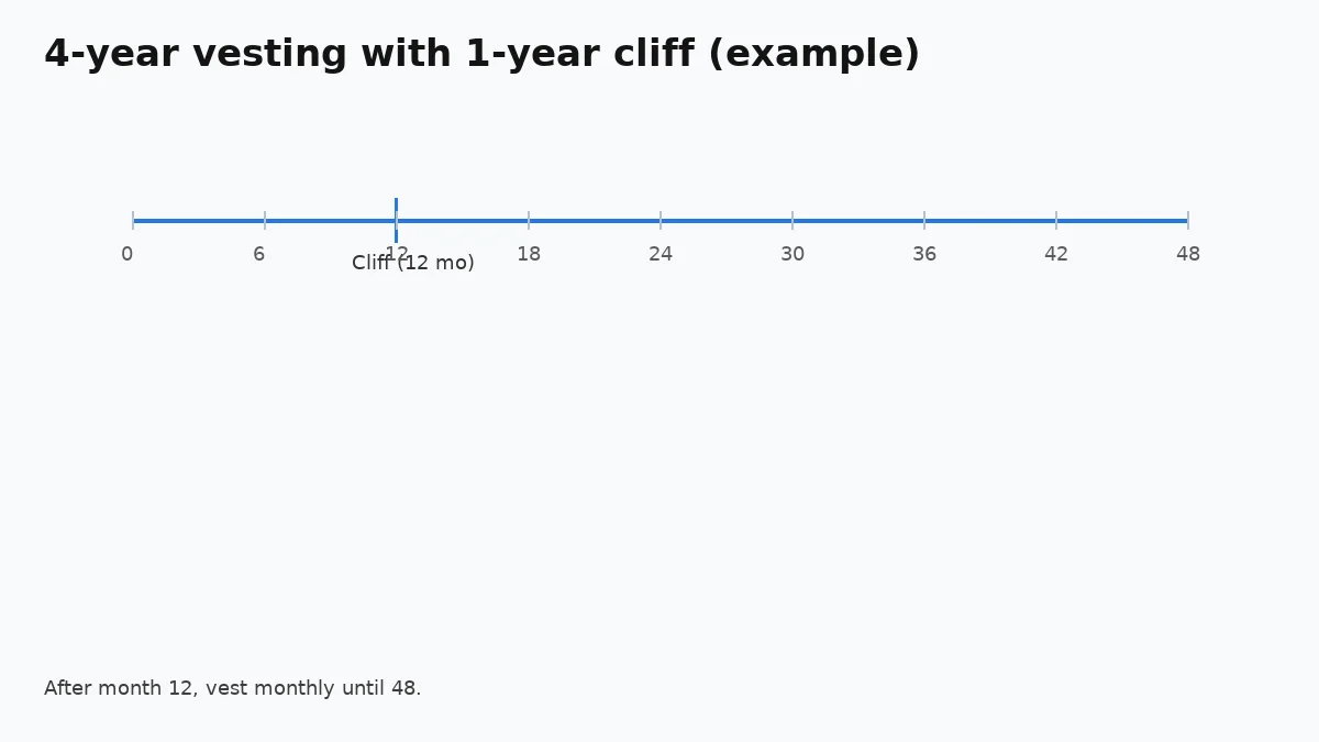 Default to 4 years with a 1‑year cliff, then monthly thereafter. Define good/bad leaver, notice periods, and a 90‑day post‑termination exercise window (adjust to fit context).