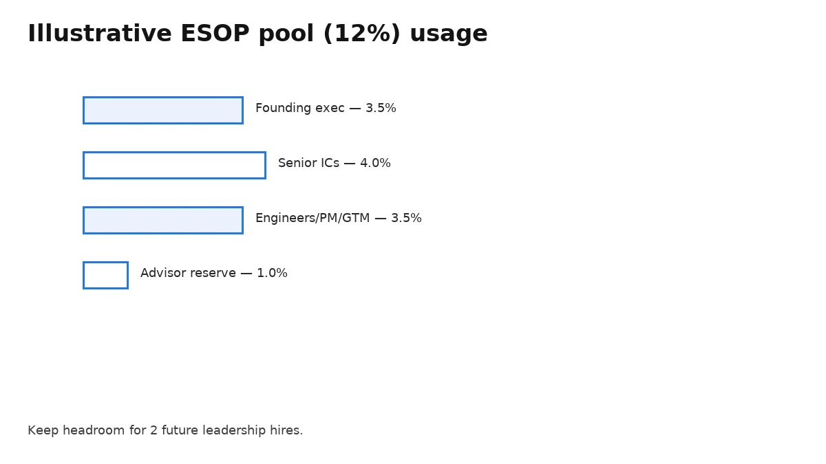 Publish pool usage by band (founding, leadership, senior ICs) and avoid over‑granting early. Reserve for two future leadership hires.