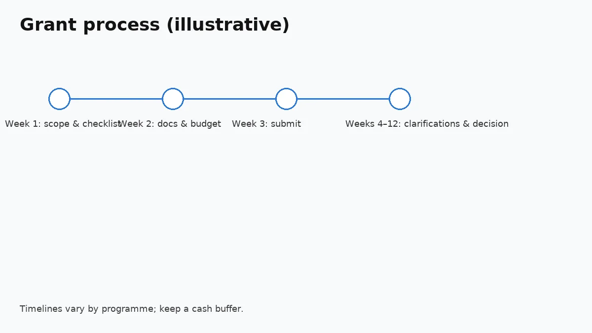 Plan 4–12 weeks from application to decision for typical SME programmes, but timelines vary; build slack into your cash plan.