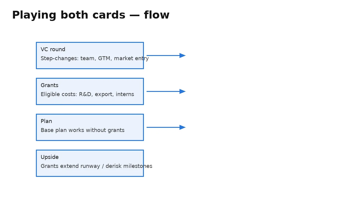 Frame grants as downside protection or milestone accelerants, not prerequisites. Keep your budget allocation clear (what’s reimbursable vs VC‑funded) and avoid double‑counting the same cost.