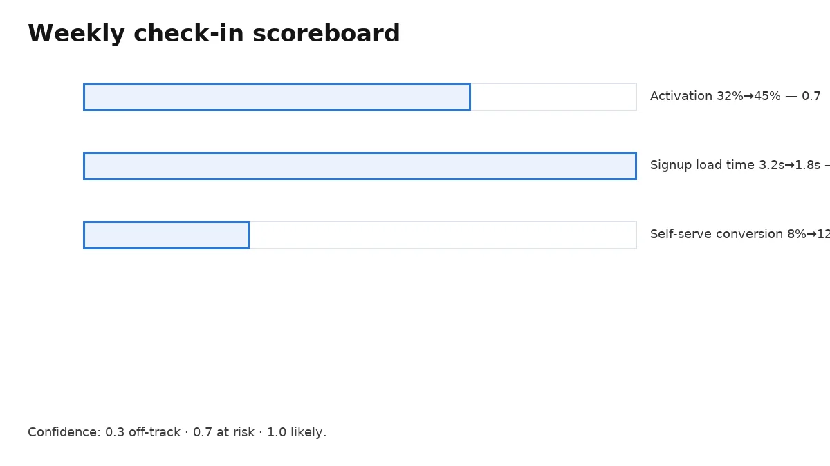 Each KR owner reports a confidence level: 0.3 off‑track, 0.7 at risk but feasible, 1.0 likely. Discuss deltas, not excuses.