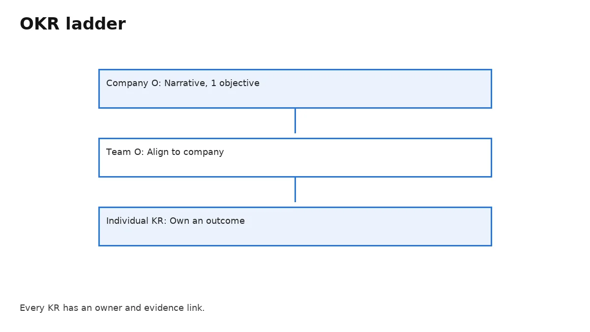 Archive each quarter’s OKR doc with YYYY‑Q naming and a one‑page summary. During fundraising or fast pivots, shorten the cycle but keep the ritual consistent.