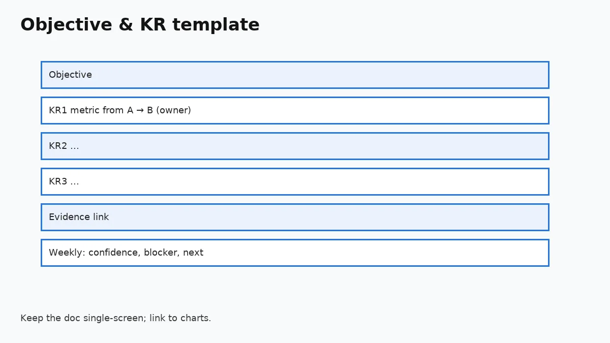 Capture one blocker and one next action per KR. If confidence stays at 0.3 for two weeks, change the plan or the KR.