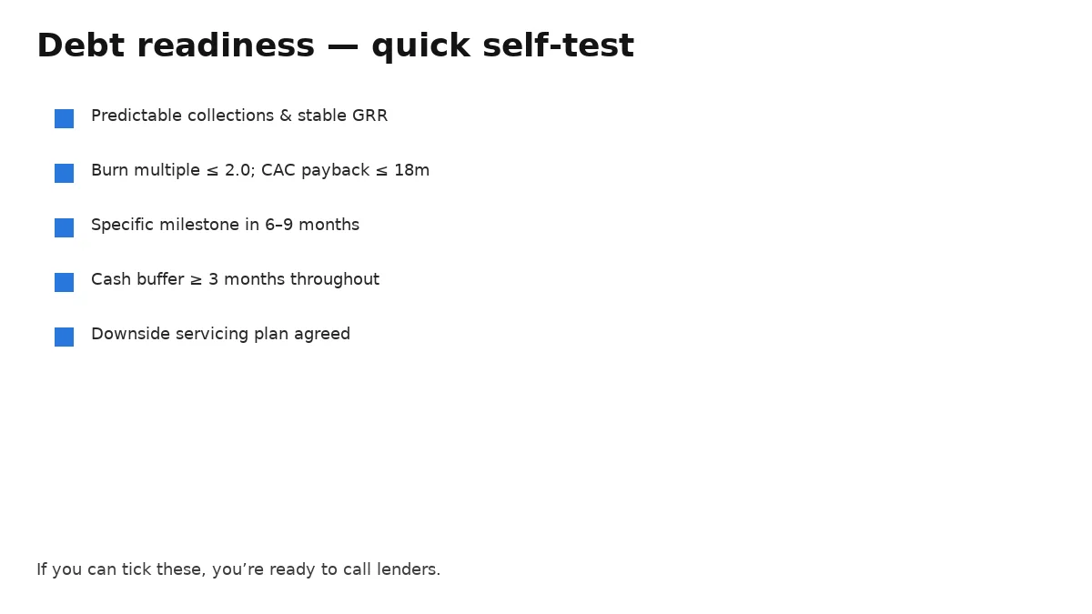 Score 1–5 on predictability (collections, churn), efficiency (burn multiple ≤2.0; CAC payback ≤18m), and milestone certainty (specific in 6–9 months). Keep a cash buffer of ≥3 months throughout the facility.