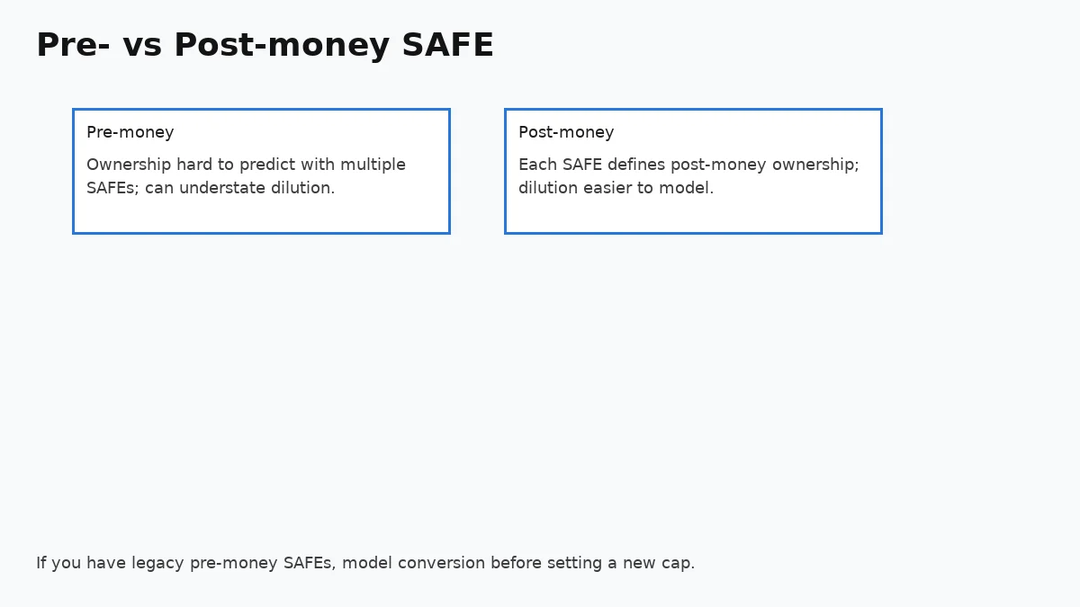Pre‑money SAFEs could underestimate dilution when multiple notes convert. Post‑money SAFEs fix this by defining ownership on a post‑money basis. If you already have pre‑money SAFEs, model both cases before you set a new cap.