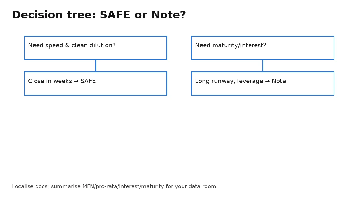 Choose the instrument based on time to priced round, leverage, and governance. If you need more than ~12–18 months before pricing, a note can keep parties engaged.