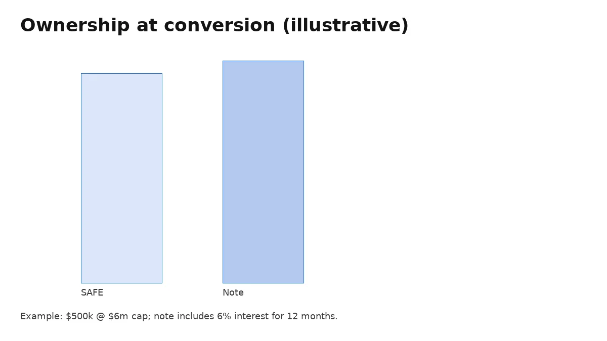 Example: raise $500k on a $6m post‑money SAFE → investor owns ~8.33% pre‑Series A. A $500k note at a $6m cap, 6% interest, converting after 12 months, converts ~8.8% before the round (principal+interest). Both are diluted by the priced round and the ESOP you top up.
