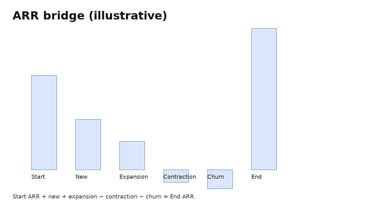 Start ARR + new business + expansion − contraction − churn = end ARR. Add a quarterly view to smooth noise; label discrete events.