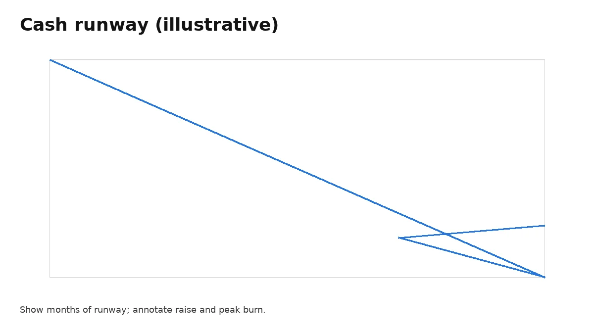 Show how cash moves each month, where burn peaks, and how the raise extends runway to 18–24 months—assuming conservative hiring and conversion.