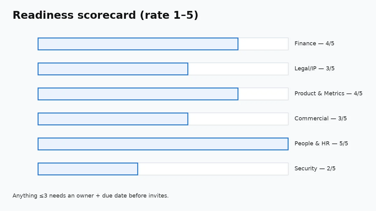 Rate each area 1–5 against clear criteria. Anything ≤3 gets an owner and a due date before you invite investors.