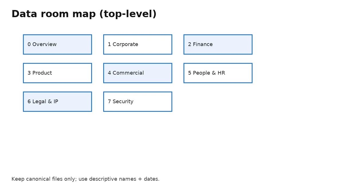 Standardise the top‑level: 0‑Overview, 1‑Corporate, 2‑Finance, 3‑Product & Metrics, 4‑Commercial, 5‑People & HR, 6‑Legal/IP, 7‑Security & Compliance.