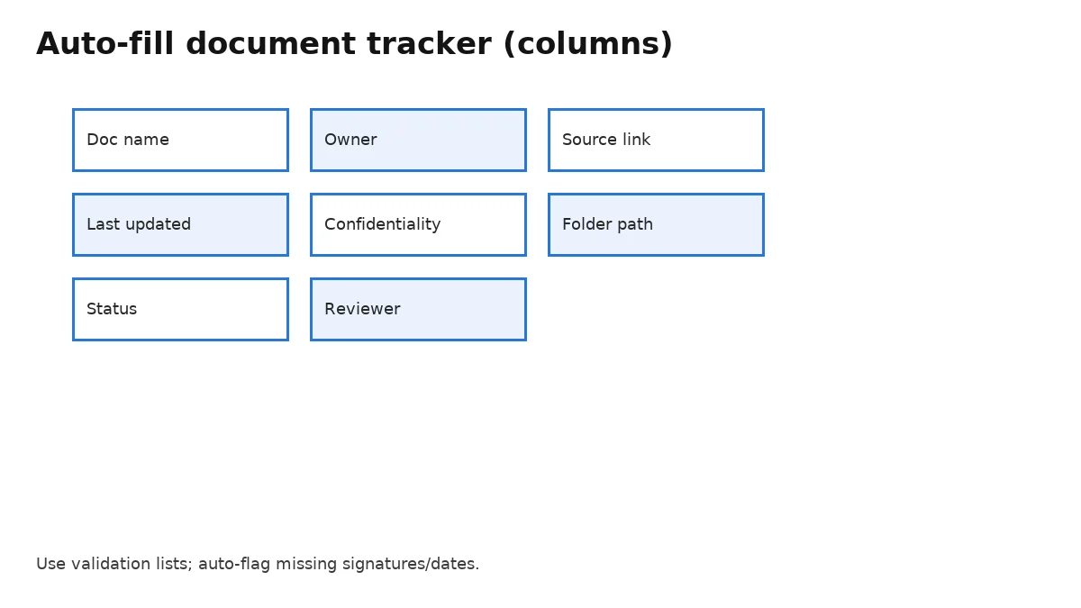 Add status, reviewer, and a short description. Use data validation for statuses and owners and formulas to flag missing signatures or stale dates.